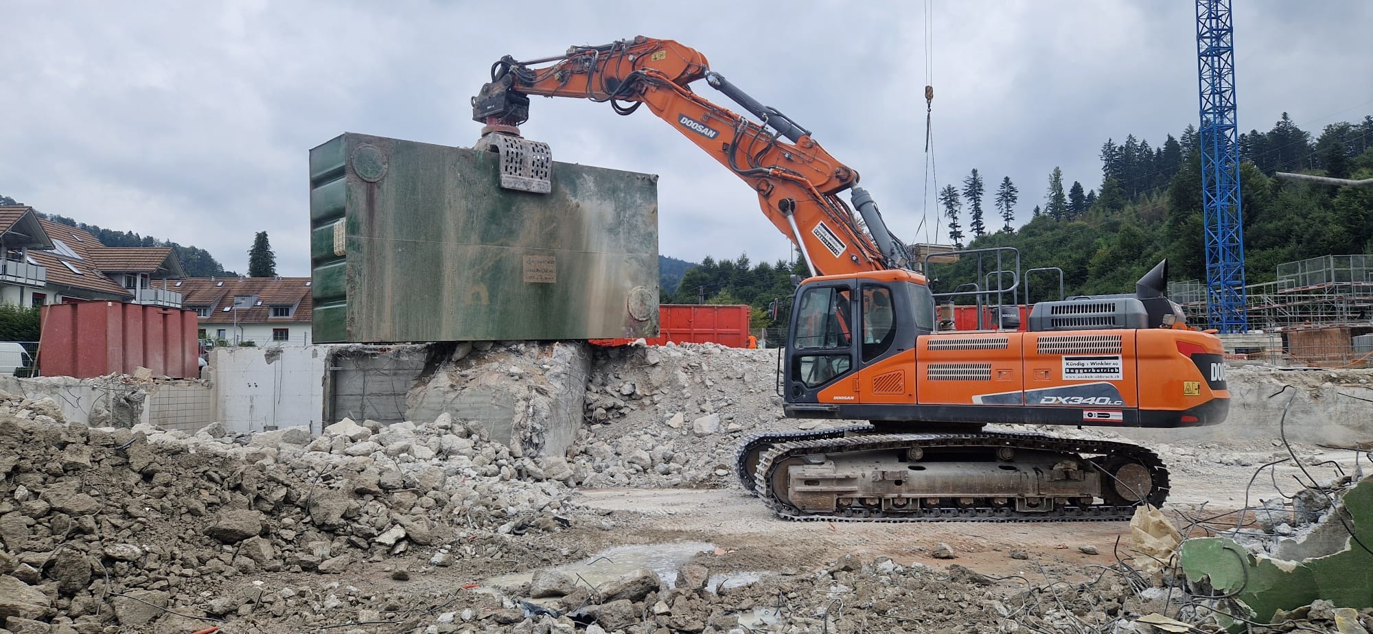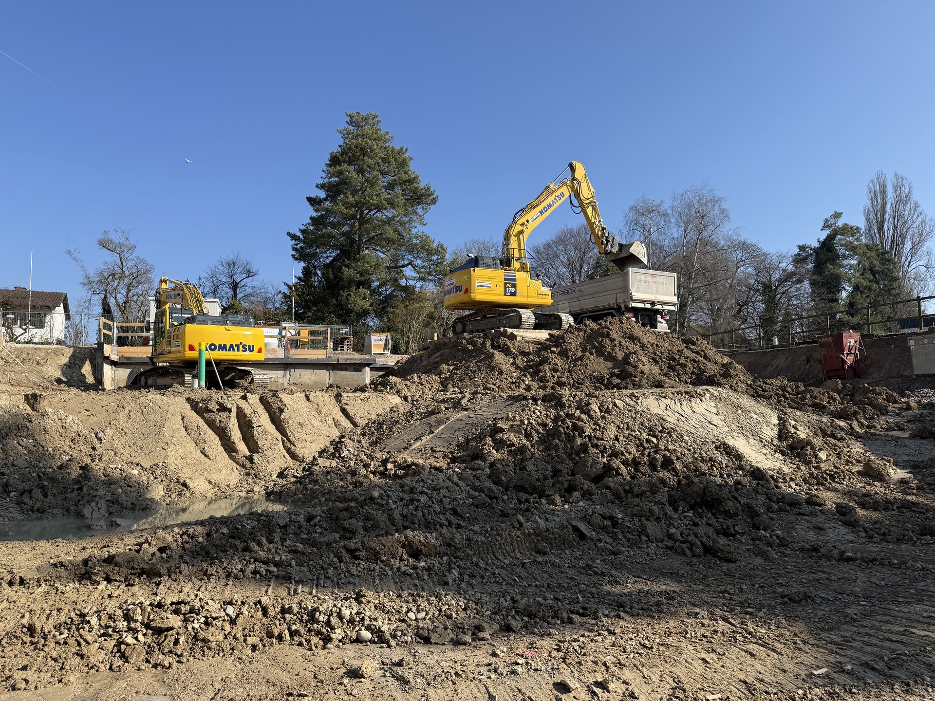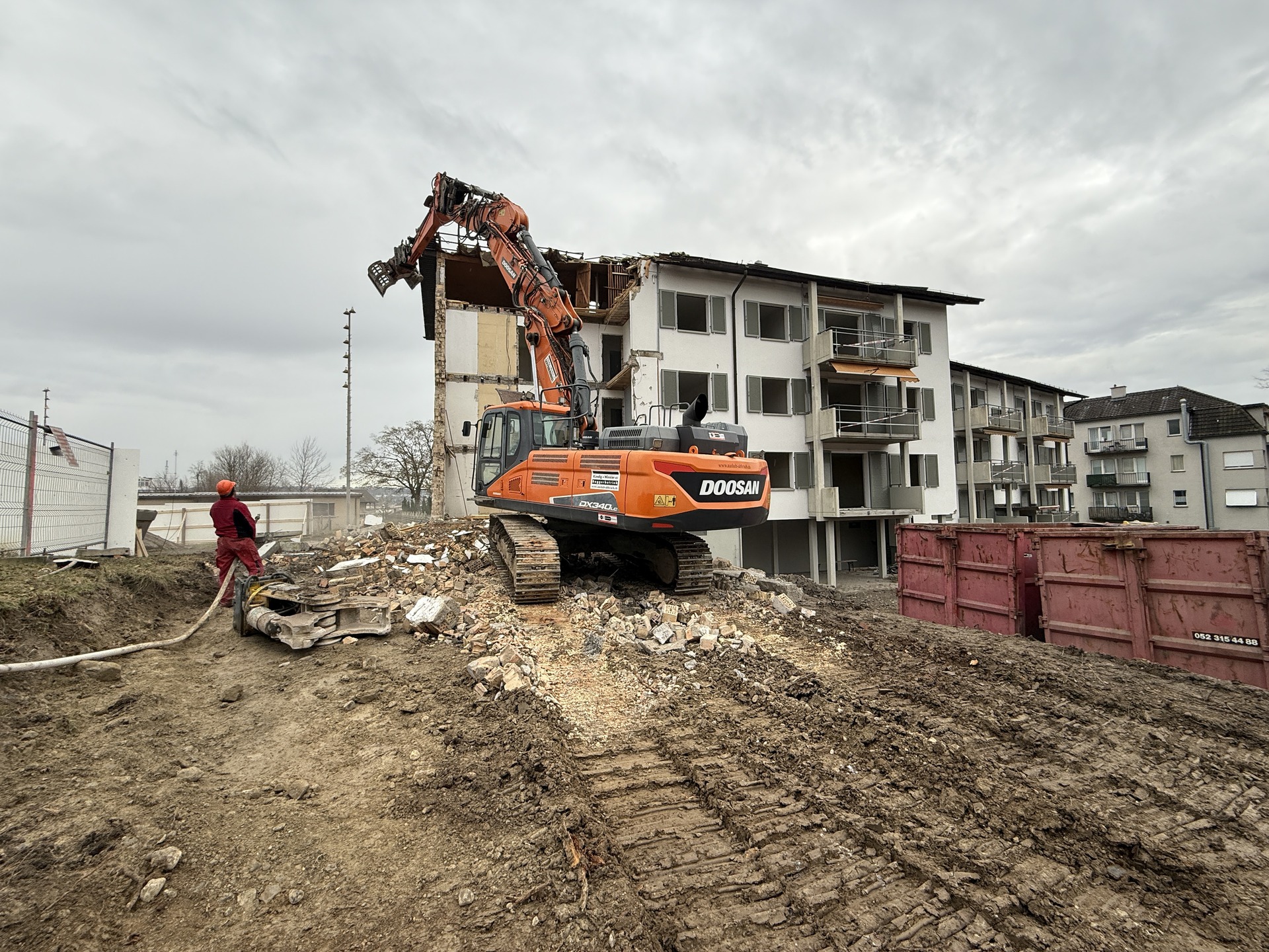 Für die Durchführung der Arbeiten setzten wir unsere Movax-Seitengrifframme sowie einen 25t Bagger ein, unterstützt von zwei weiteren Baggern, einem Komatsu 14t und einem Komatsu 2.6t. Um die straffen Zeitpläne einzuhalten, war ein reibungsloses Zusammenspiel aller Beteiligten, von der Arbeitsvorbereitung bis zur Ausführung, von entscheidender Bedeutung.