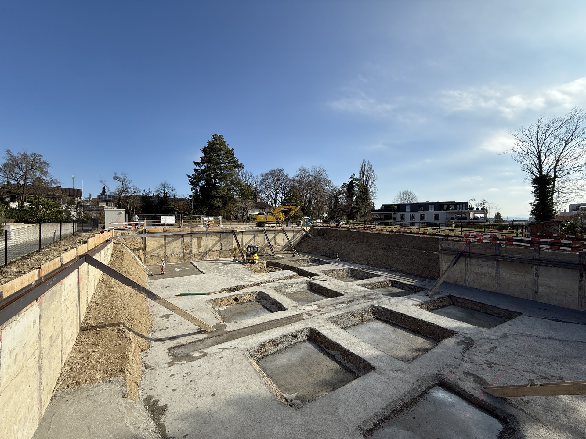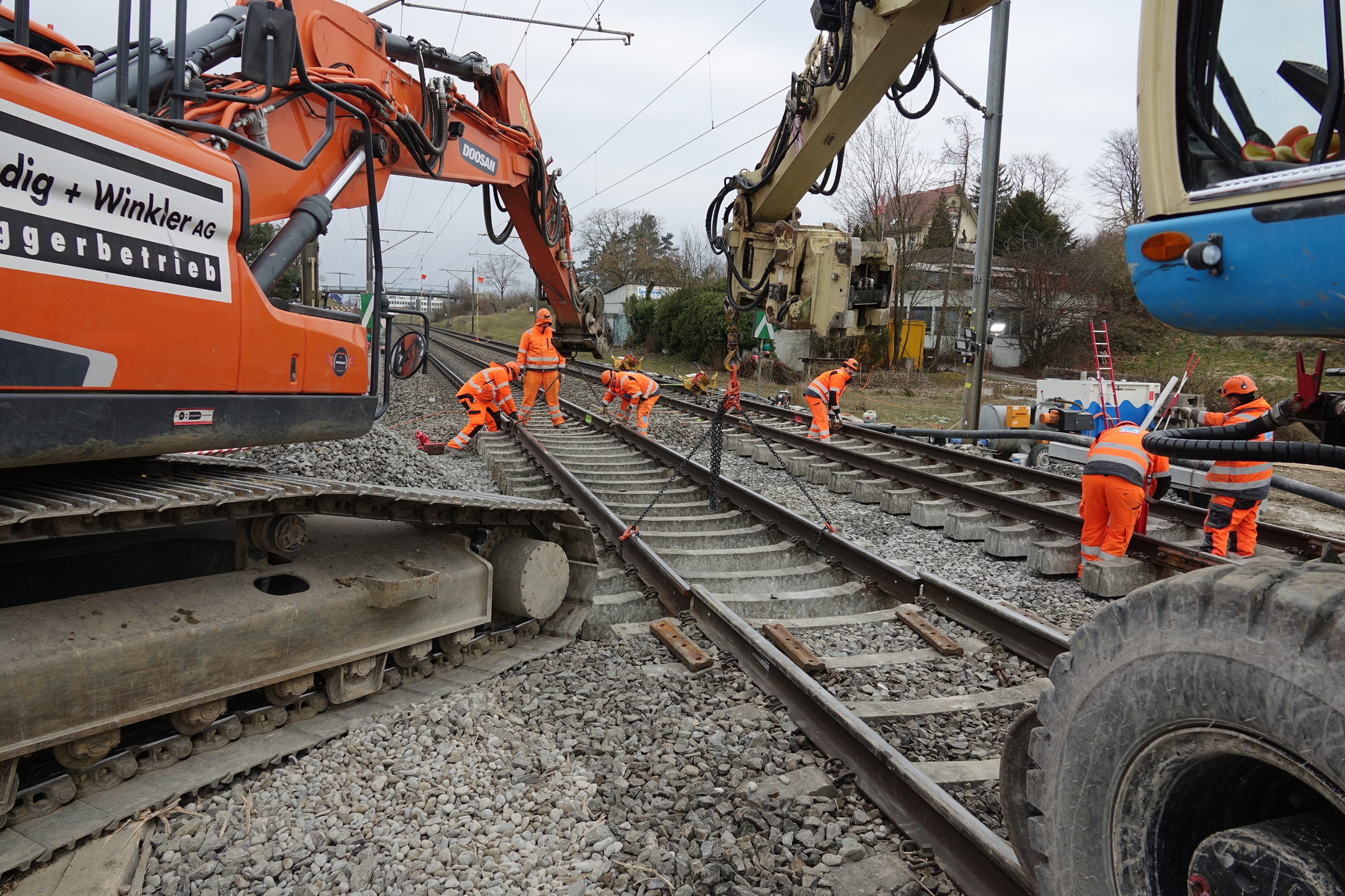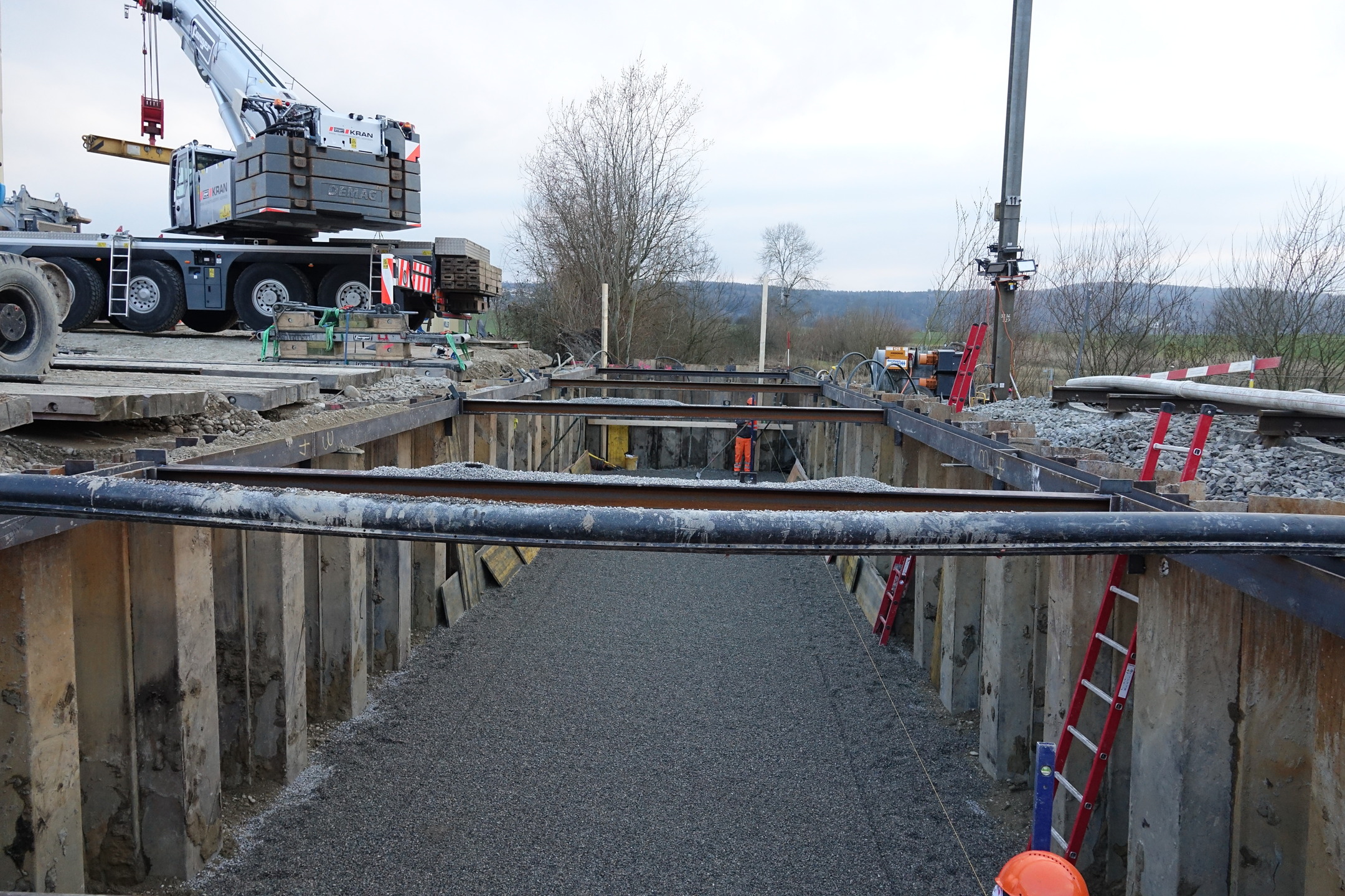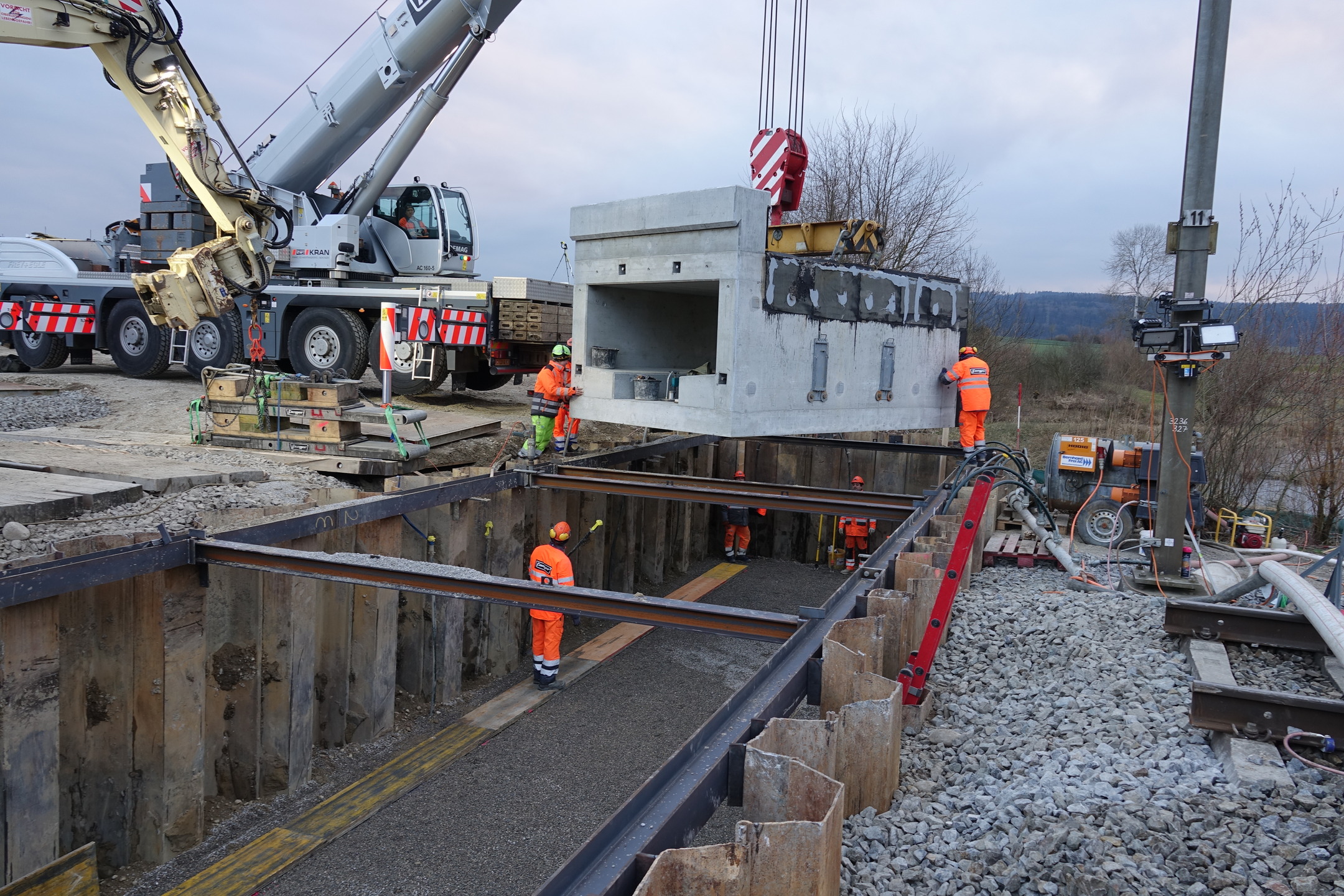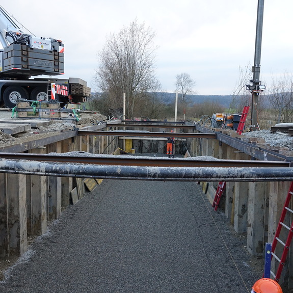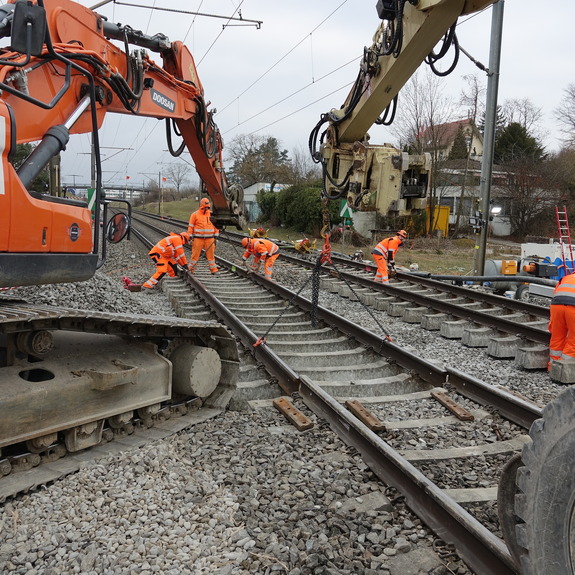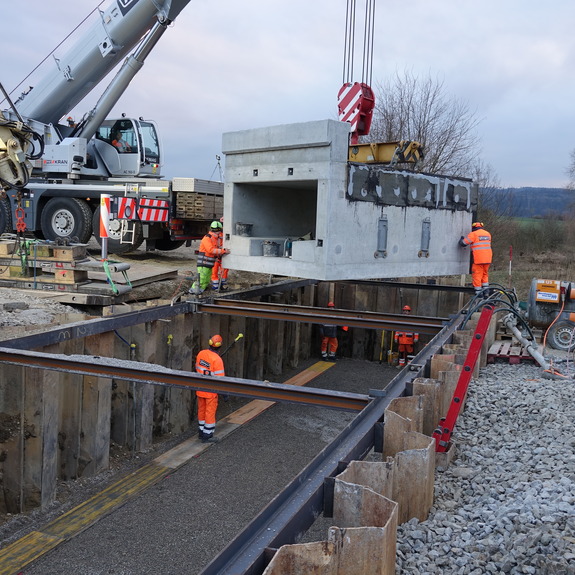 Im Rahmen der Erneuerung des Amphibiendurchlasses Klostergraben an der SBB-Linie zwischen Dübendorf und Schwerzenbach, hat die Kündig + Winkler AG im Auftrag der Müller Gleisbau AG Spezialtiefbauarbeiten ausgeführt. Vorbereitend wurden in drei Nachteinsätzen vom 10. bis 13. Feb. Spundwände eingetrieben. Die eigentlichen Hauptarbeiten mit dem Versetzen der Tunnelelemente fanden in zwei Nachteinsätzen vom 28. Feb. auf den 1. März sowie vom 1. auf den 2. März statt.